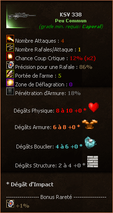Les bonus dus à la rareté de votre arme sont affiché en bas du cadre et sont toujours comptabilisés dans les chiffres marqués au dessus (ici on peut donc dire que l'arme aurait 85% de précision sans la rareté).